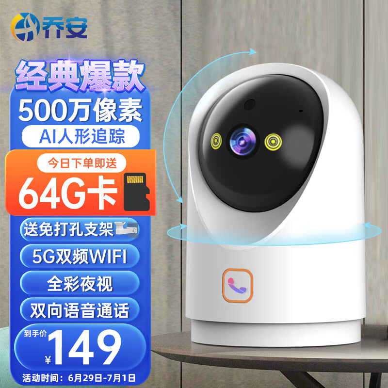 乔安监控摄像头500万像素智能摄像机wifi手机远程对讲360度无死角带夜视全景家用3K超高清室内监控器价格:149.00元!