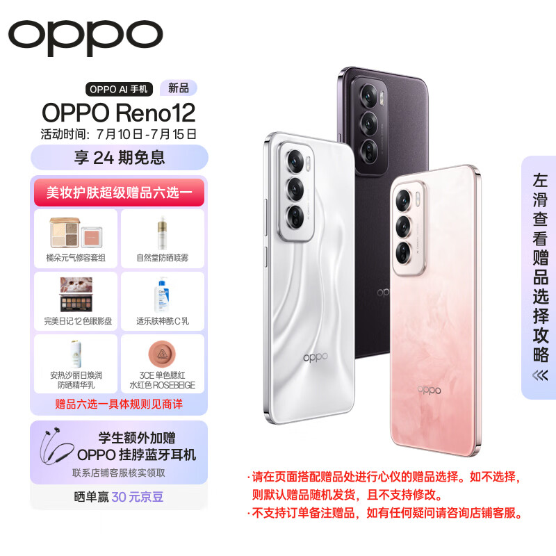 OPPO Reno12 超美小直屏 安卓Live图 天玑8250旗舰芯 12GB+512GB 千禧银 5G手机【美妆护肤礼赠6选1】价格:2999.00元!