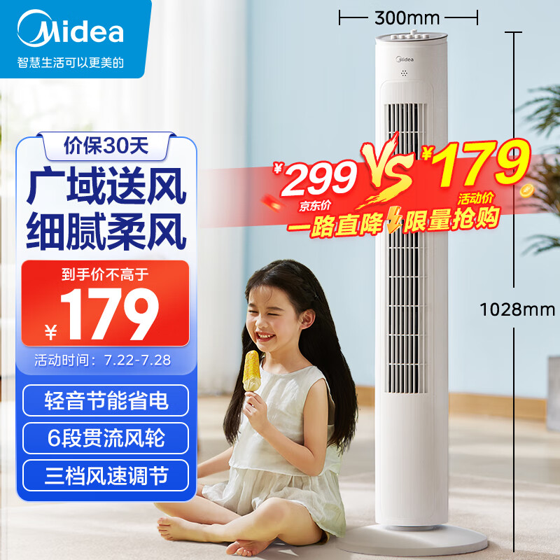 美的(Midea)【轻音节能】定时塔扇/家用电风扇/大风力无叶风扇/轻音电扇/柔风落地扇/台式摇头小风扇 ZAF09MA价格:189.00元!