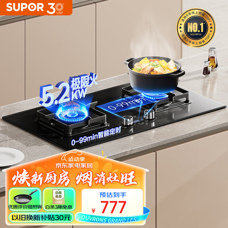 苏泊尔(SUPOR)燃气灶双灶家用 天然气双灶具5.2kW猛火大火力 嵌入式台式两用灶台 智能定时 全进风DB2Z7S天价格:798.00元!