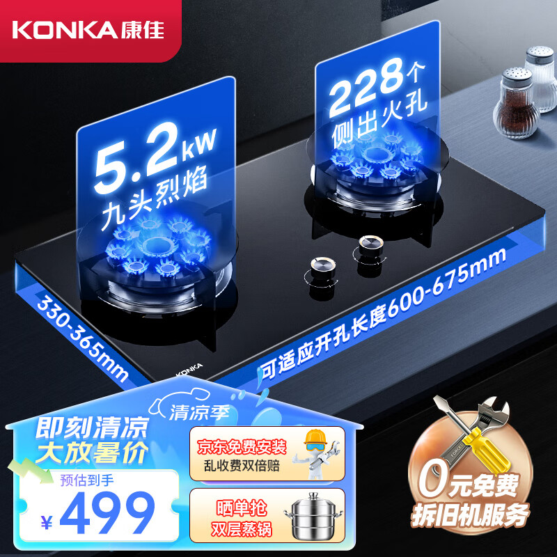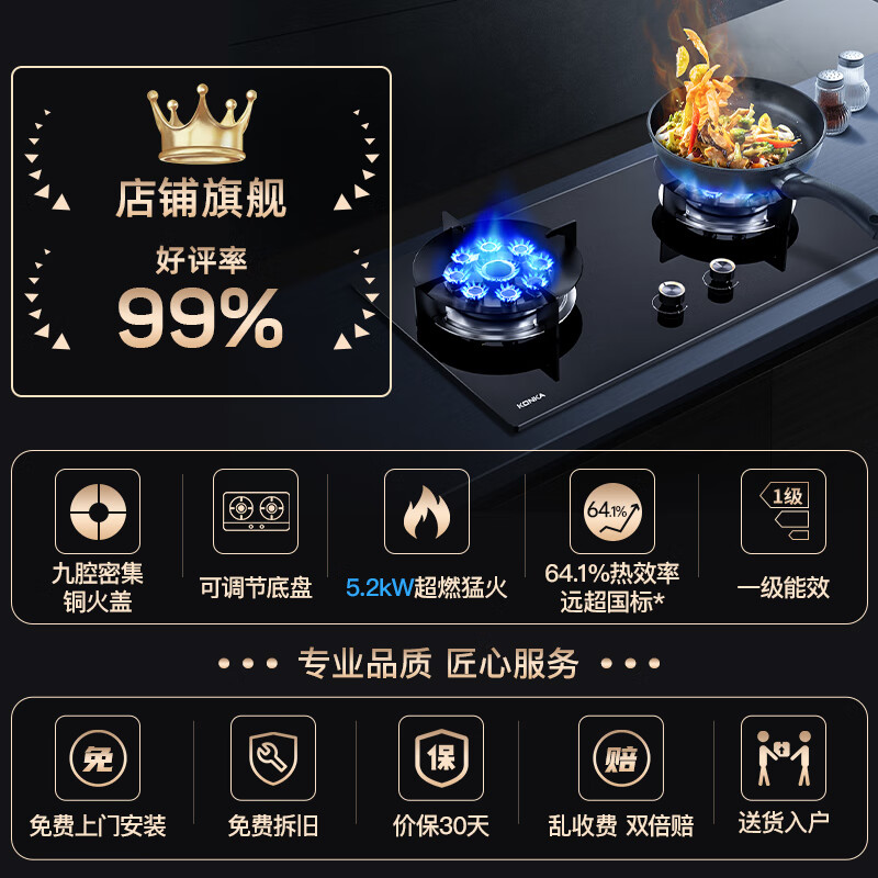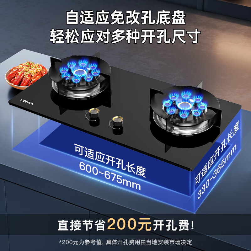 康佳(KONKA)灶具燃气灶双灶 双九孔5.2kW聚能猛火爆炒专用 家用台式/嵌入式钢玻面板 JZT-B902Y(天然气)价格:498.00元!