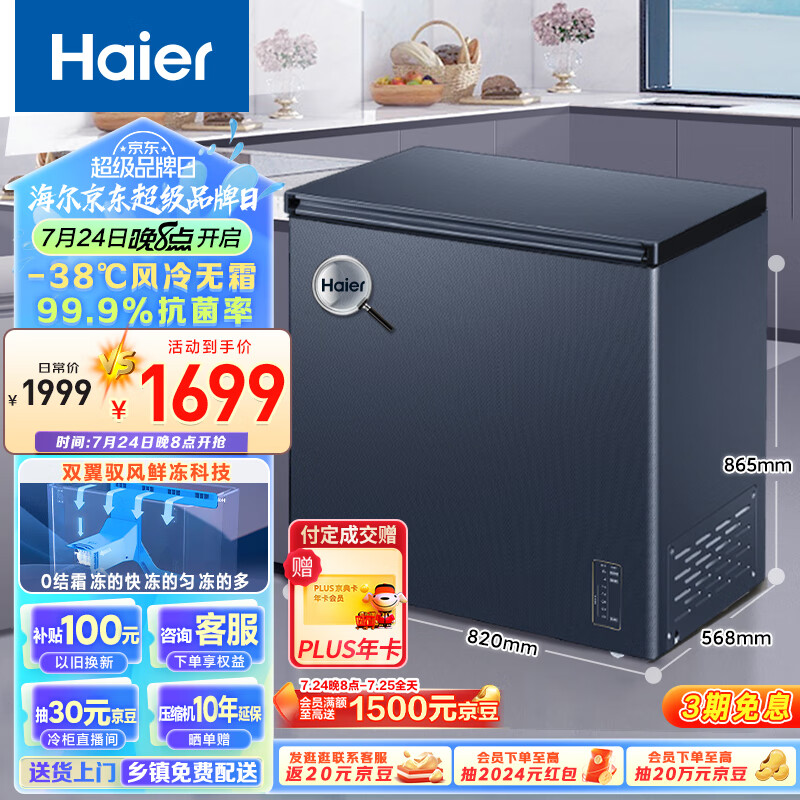 海尔(Haier)159升风冷无霜冰柜家用商用一级能效省电保鲜全冷冻卧式冷柜BC/BD-159WGHED以旧换新价格:1699.00元!