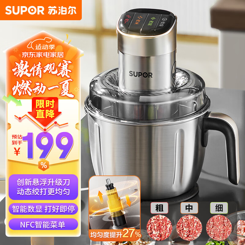 苏泊尔(SUPOR)绞肉机家用 电动多功能不锈钢悬浮刀料理搅拌机2.2L大容量馅婴儿辅食机 可调粗细搅肉机JR65-G220价格:199.00元!