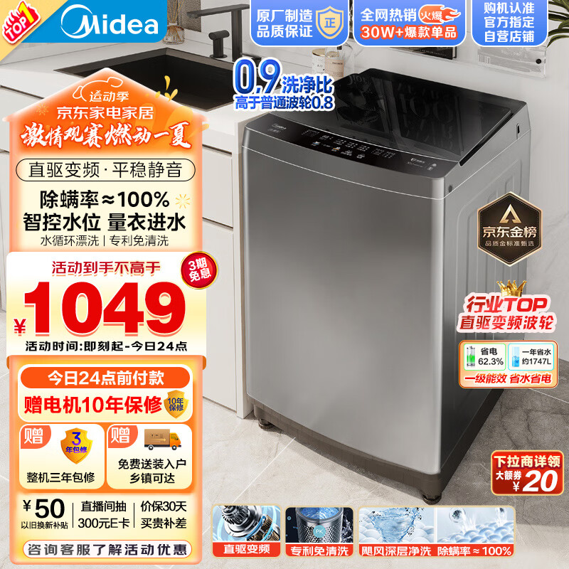 美的(Midea)波轮洗衣机全自动家用 MB100V13DB 10公斤 随心洗系列 直驱变频电机 健康除螨 专利免清洗价格:1049.00元!
