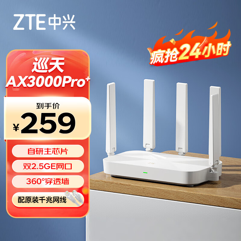中兴(ZTE) 巡天AX3000Pro+路由器 5G双频超千兆双2.5G Mesh无线路由器 WIFI6 电竞路由穿墙大覆盖价格:259.00元!