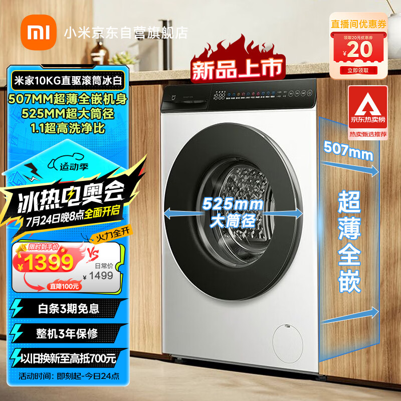 米家小米10公斤滚筒洗衣机全自动超薄全嵌机身525mm超大筒径1.1高洗净比直驱电机深层除螨XQG100MJ106价格:1399.00元!