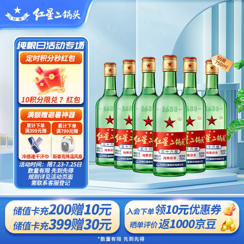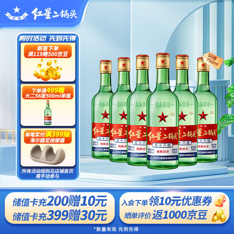 红星二锅头大二 清香型白酒 56度 750ml*6 整箱装 口粮酒价格:179.00元!