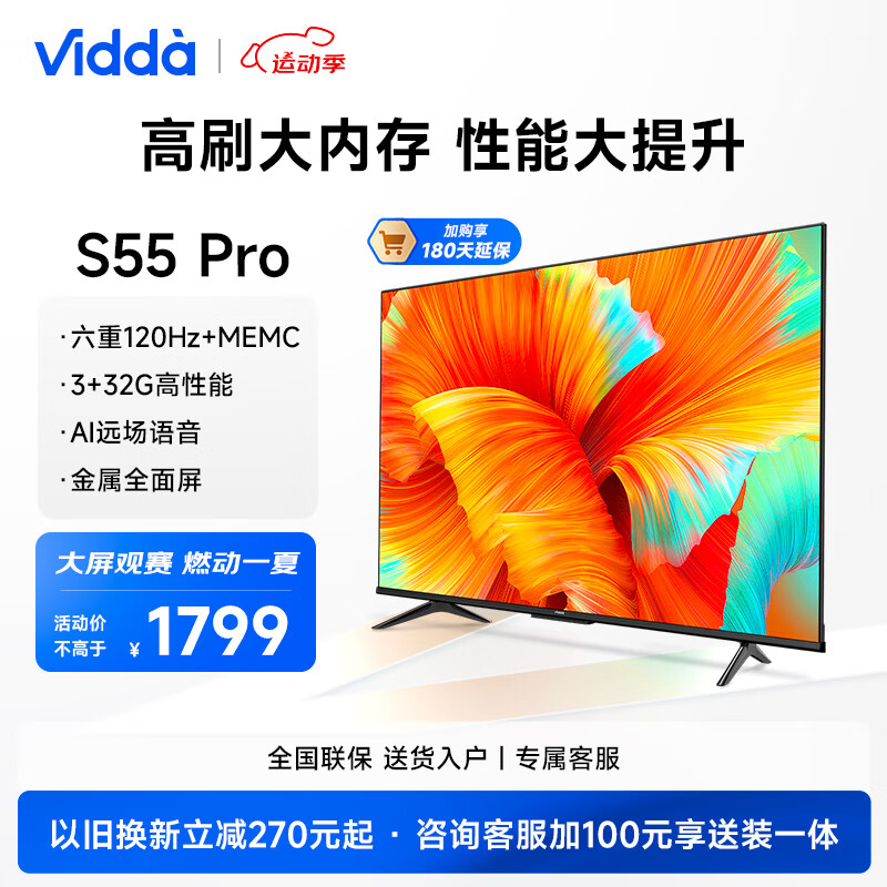 Vidda S55 Pro 海信电视 55英寸 120Hz高刷 3+32G MEMC防抖 超薄智能欧洲杯大屏电视以旧换新55V1K-S价格:1799.00元!