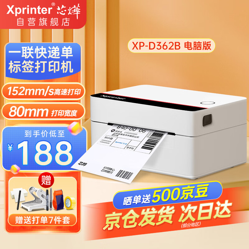 芯烨(XINYE)XP-D362B 80mm热敏标签一联快递单专用电子面单 USB 仓储物流快递单条码不干胶打印机价格:208.00元!