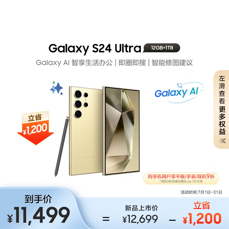 三星(SAMSUNG)Galaxy S24 Ultra AI手机 第三代骁龙8 游戏手机 2亿像素 拍照手机 钛金属边框 12GB+1TB 钛羽黄价格:11499.00元!