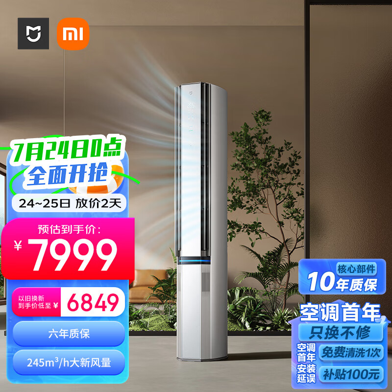 小米3匹 超一级能效 新风Pro双出风 冰晶白 245m3/h大新风量 新风空调 变频冷暖 空调柜机价格:7999.00元!