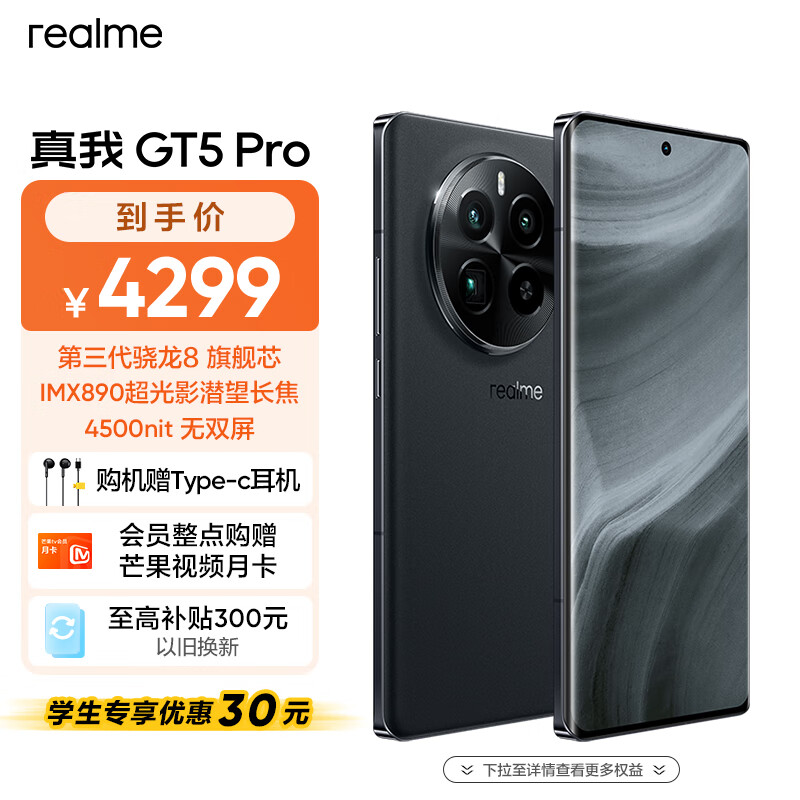 realme真我GT5 Pro第三代骁龙8旗舰芯 IMX890潜望长焦 4500nit无双屏 5G游戏AI手机 16GB+1TB星夜价格:4299.00元!
