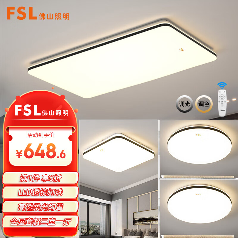 FSL佛山照明灯具套餐LED吸顶灯智能客厅卧室灯遥控调色三室一厅54058价格:1081.00元!