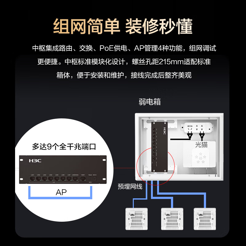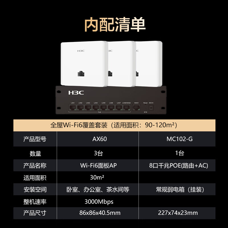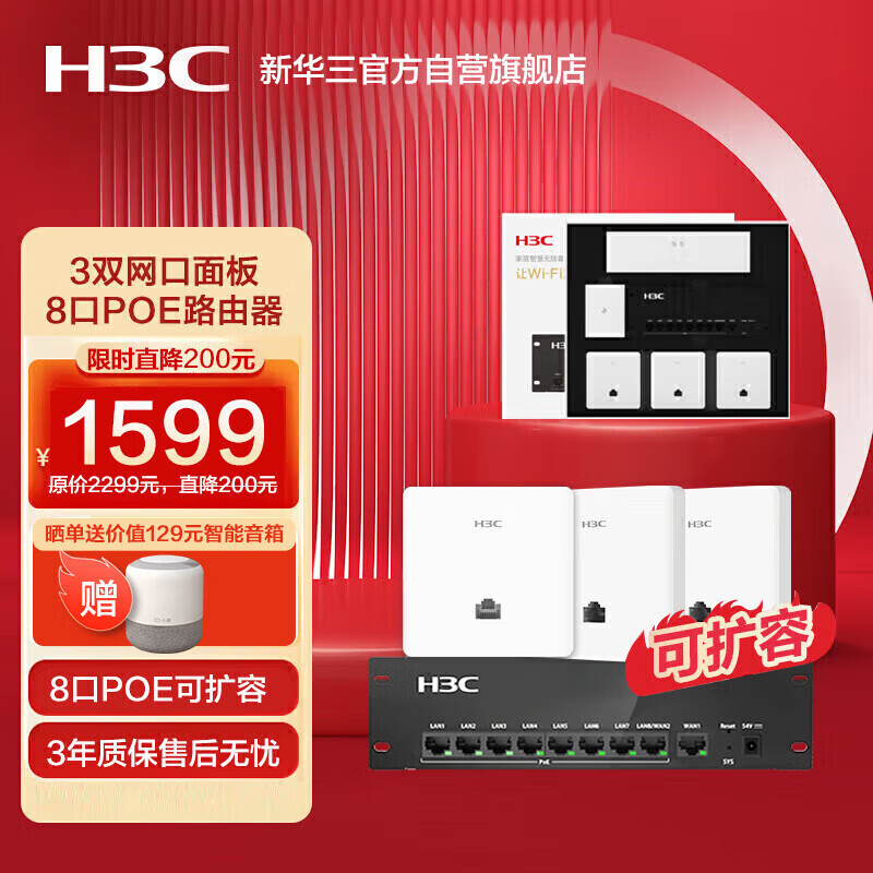 新华三(H3C)全屋WiFi套装 3个无线AP面板+8口PoE路由器 家用企业分布式千兆路由器 无缝漫游价格:1599.00元!