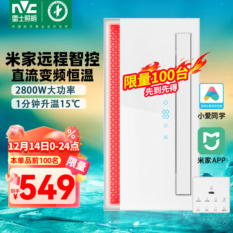 雷士(NVC)米家智能变频浴霸暖风照明排气一体机浴室电暖器卫生间集成吊顶价格:999.00元!