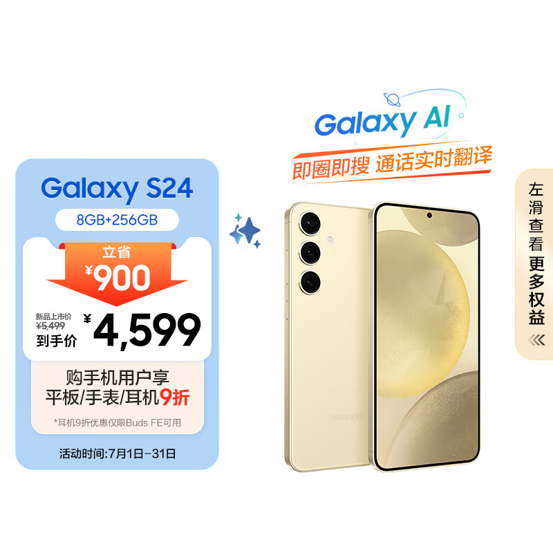 三星(SAMSUNG)Galaxy S24 AI手机 超视觉影像 5000万像素 拍照手机 第三代骁龙8 游戏手机 8GB+256GB 浅珀黄价格:4599.00元!