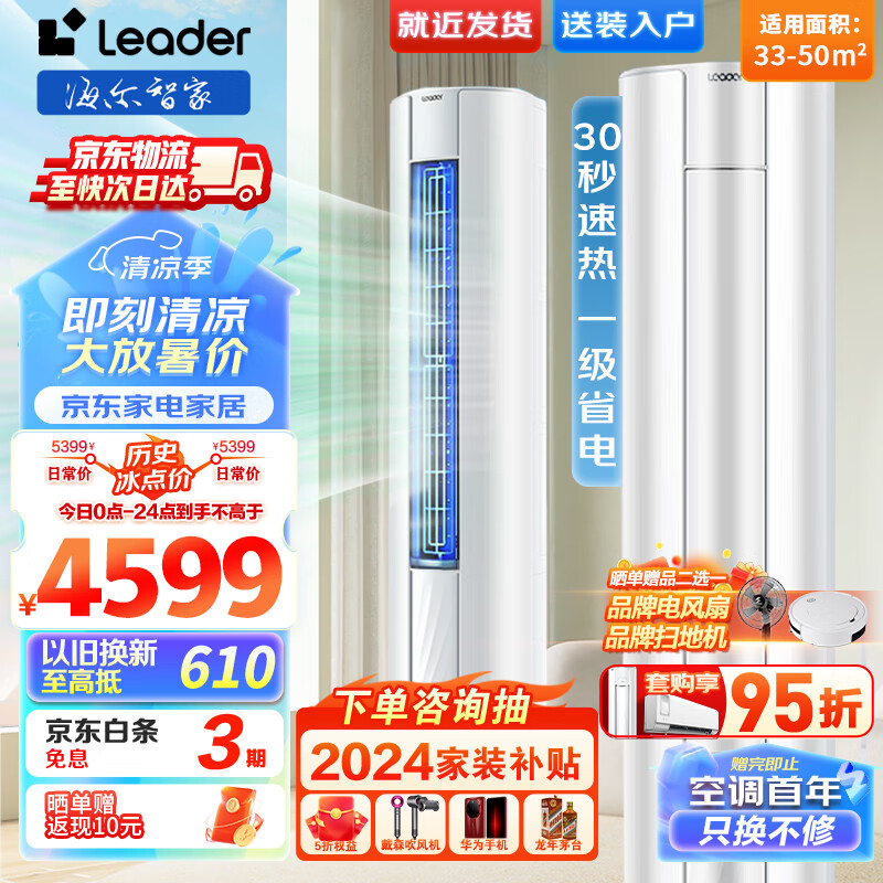 Leader空调柜机海尔出品3匹新一级能效变频冷暖APP智控客厅立柜式自清洁智能防直吹 以旧换新72WDB81价格:4599.00元!