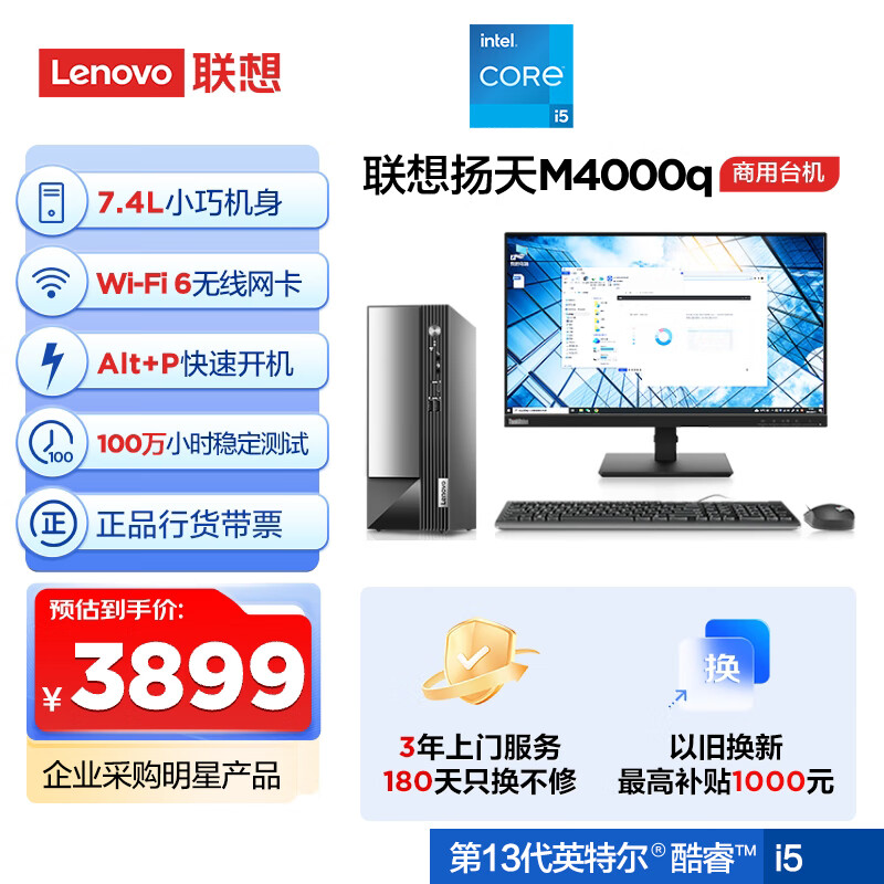 联想(Lenovo)扬天M4000q 商用办公台式电脑主机(酷睿13代i5-13400 16G 1TB SSD)23英寸价格:3899.00元!