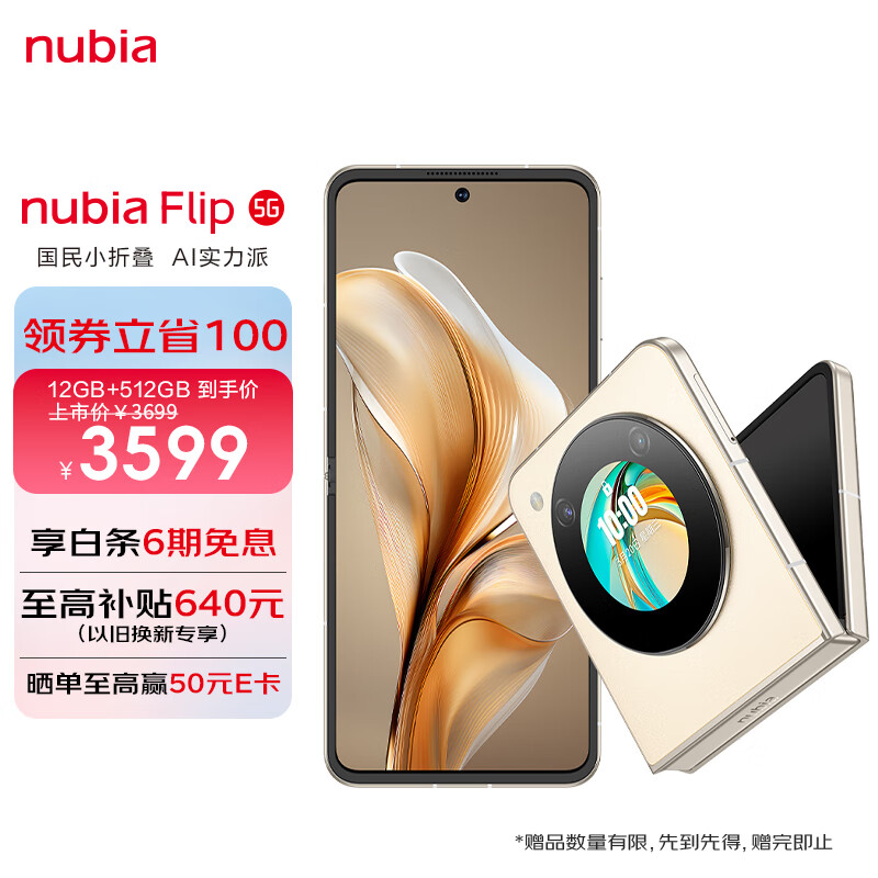 nubia努比亚 Flip 12GB+512GB 奶茶色 高通骁龙芯片 5000万后置双摄 120Hz屏 5G拍照AI小折叠屏价格:3699.00元!