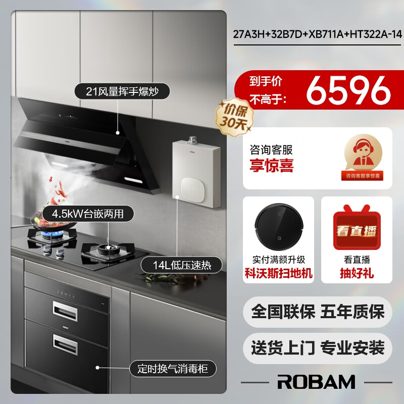 老板(Robam)厨房多件套 家用挥手21风量免拆洗抽油烟机灶具消毒柜燃气热水器27A3H+32B7DT+XB711A+HT322A-14价格:6596.00元!