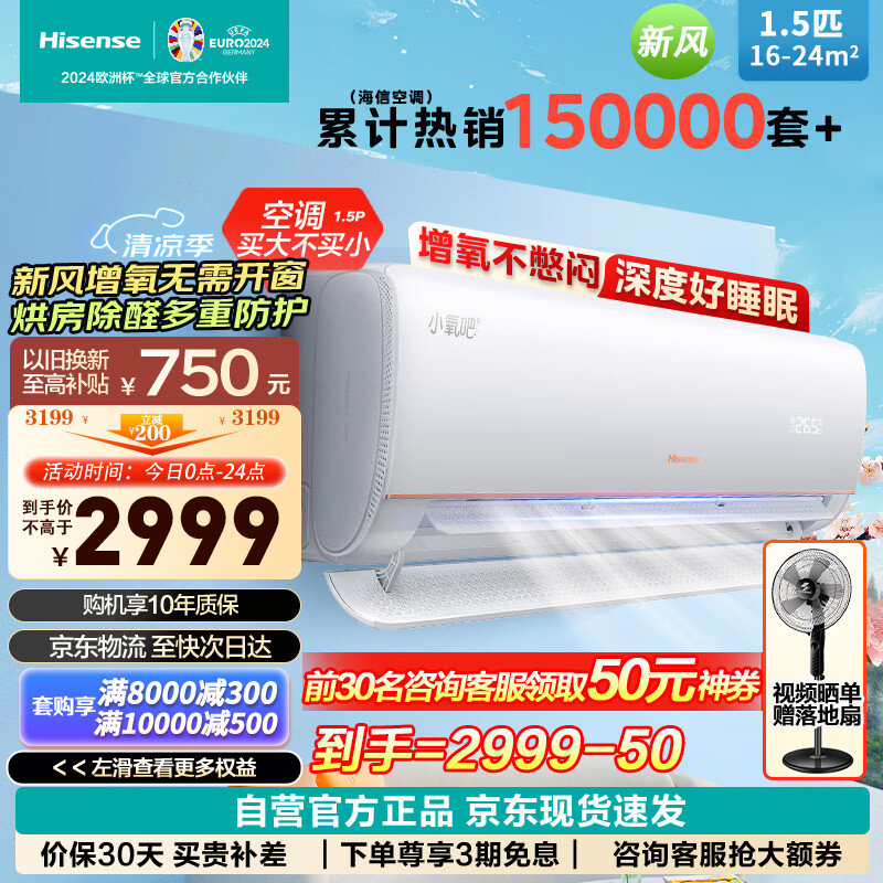 海信(Hisense)新风空调挂机大1.5匹 增氧大风量 新一级能效壁挂机 小氧吧X5 APP智控 KFR-35GW/X500U-X1以旧换新价格:2999.00元!