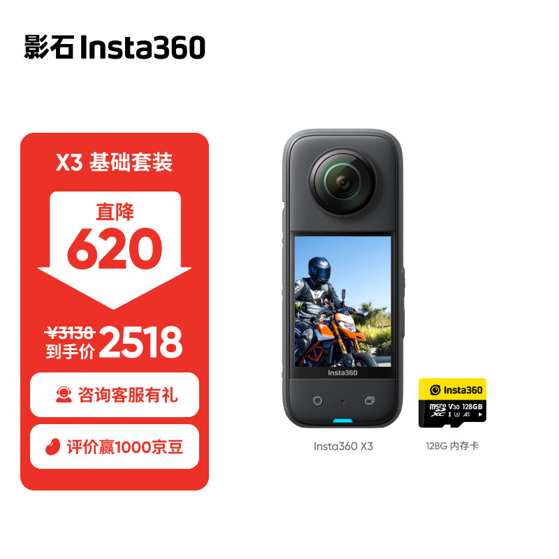 Insta360影石 X3全景运动相机防抖防水摄像机5.7K高清Vlog摩托车骑行滑雪潜水路亚(基础套装)价格:2518.00元!