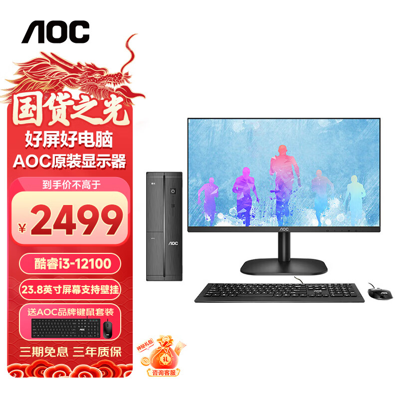 AOC显示器电脑套装电脑台式机整机主机(12代i3-12100 16G 512G 商务键鼠 三年上门)23.8英寸价格:2499.00元!