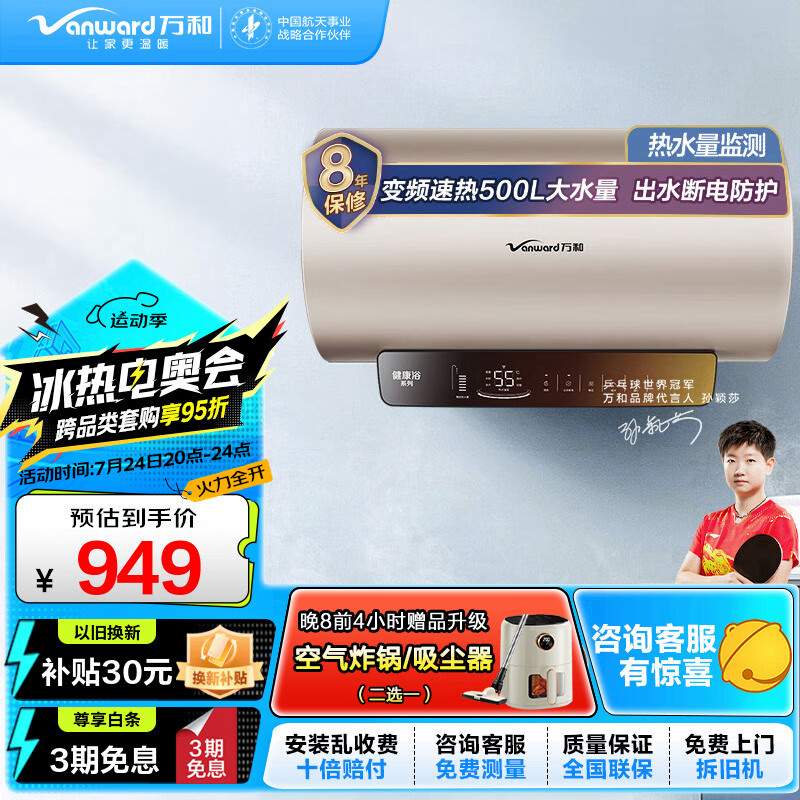 万和(Vanward)50升电热水器速热出水断电3000W一级能效10倍增容镁棒免更换水量水质监测E50-Q8D1-30 以旧换新价格:1249.00元!