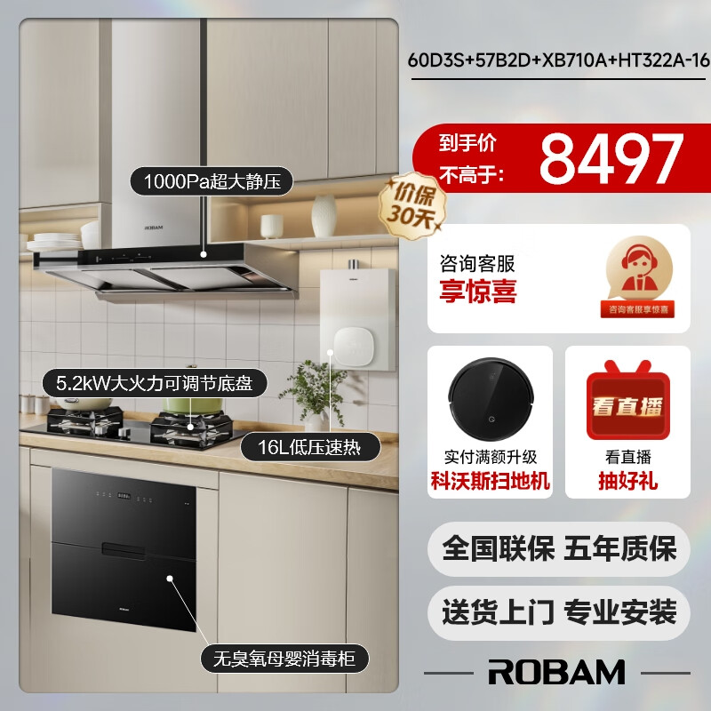 老板(Robam)厨房多件套 欧式24风量双腔吸油烟机挥手 灶具消毒柜燃气热水器60D3S+57B2DT+XB710A+HT322A-16价格:8497.00元!