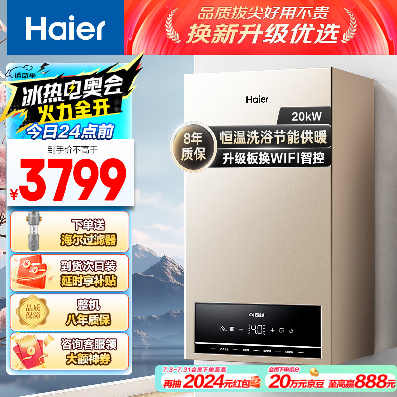 海尔(Haier)燃气壁挂炉天然气板换式采暖炉家用地暖供暖全屋热水节能 WIFI智控多点恒温以旧换新L1PB20-HJ5价格:3799.00元!