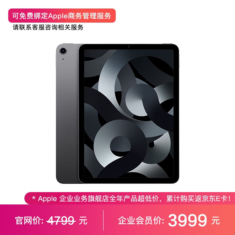 Apple iPad Air 10.9英寸平板电脑 2022年款(64G WLAN版/M1芯片Liquid视网膜屏)深空灰色 MM9C3CH/A*企业专享价格:4799.00元!