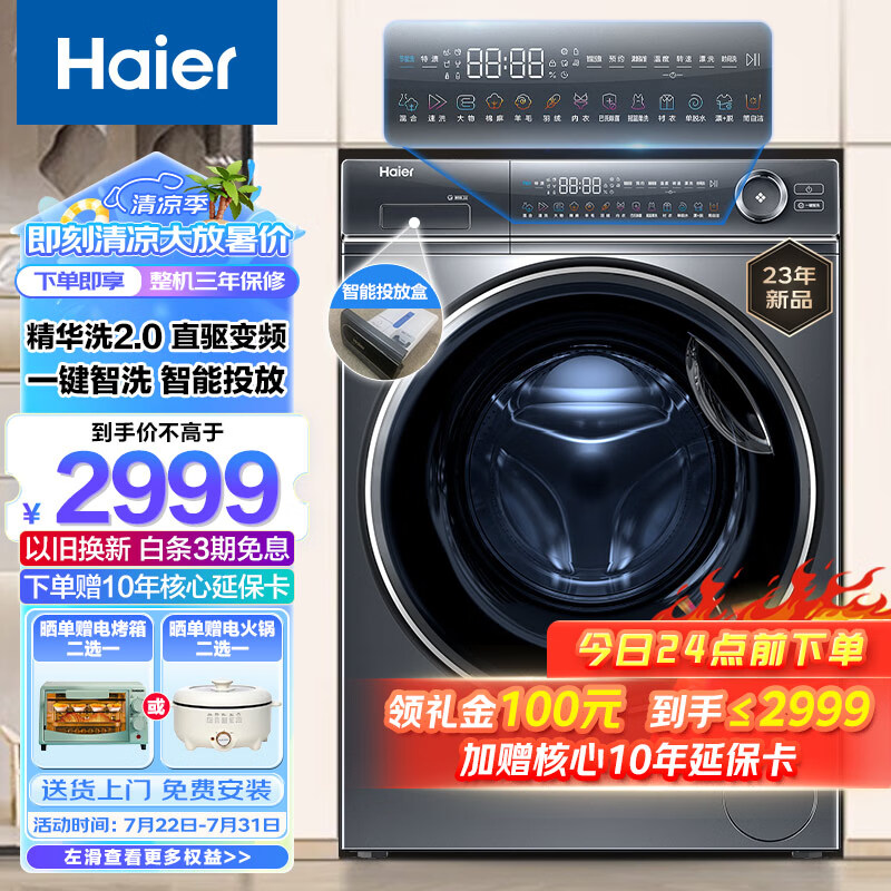 海尔(Haier)【升级精华洗2.0】10KG滚筒洗衣机全自动直驱变频一级能效一键智洗+智能投放+除菌螨EG100BD66S价格:3099.00元!