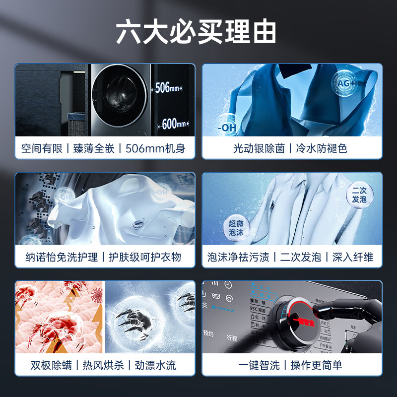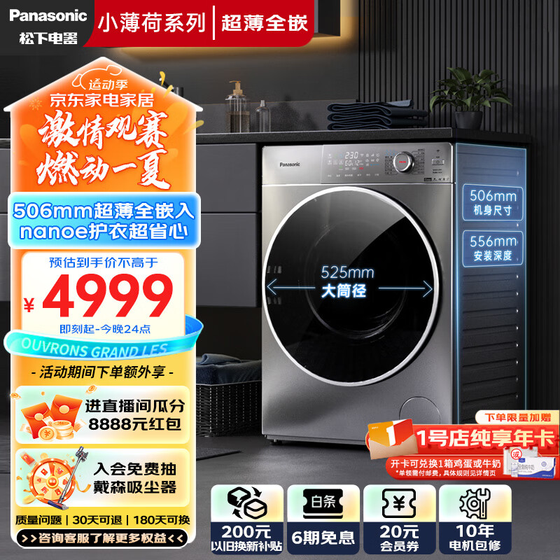 松下(Panasonic)滚筒洗衣机全自动506超薄全嵌【小薄荷 】10公斤洗烘一体纳诺怡光动银户外服XQG100-ND139价格:4999.00元!