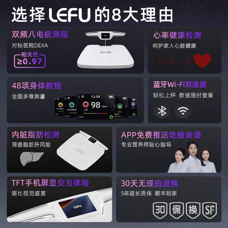 乐福能量云LEFU智能八电极体脂秤健身房减肥专用精准体重秤家用电子秤人体称重秤高精度双频测脂仪价格:799.00元!