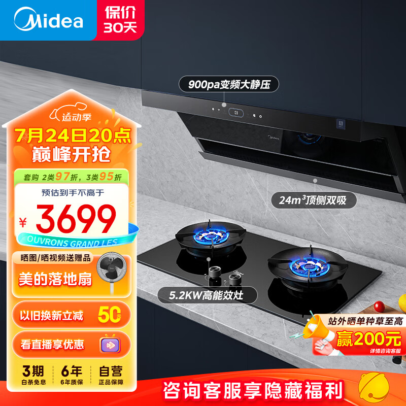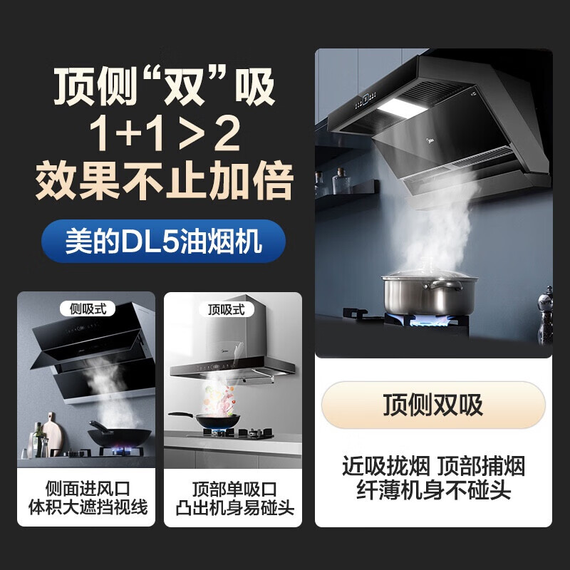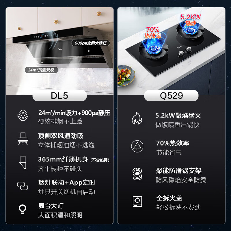美的(Midea)抽油烟机 5.2kW燃气灶具家用顶侧双吸24风量大吸力变频大吸力 烟灶联动套装DL5+Q529天然气价格:3699.00元!