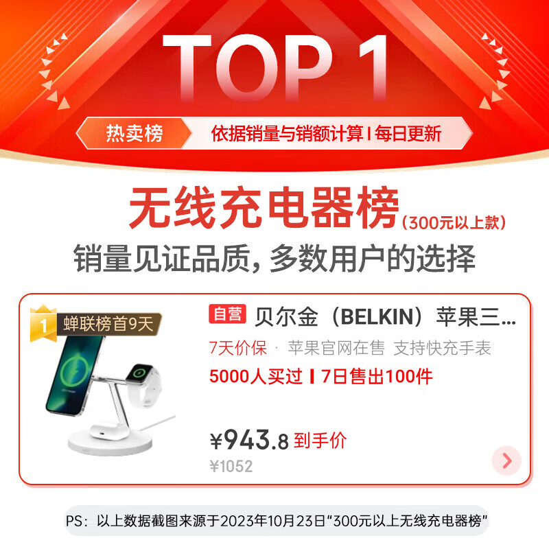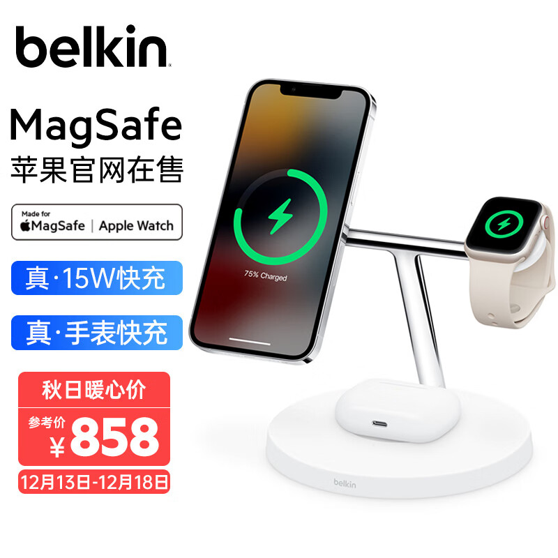 贝尔金(BELKIN)苹果三合一充电器 桌面充电板 iPhone手机15W MagSafe磁吸快充 Watch手表快充 WIZ017白价格:931.10元!