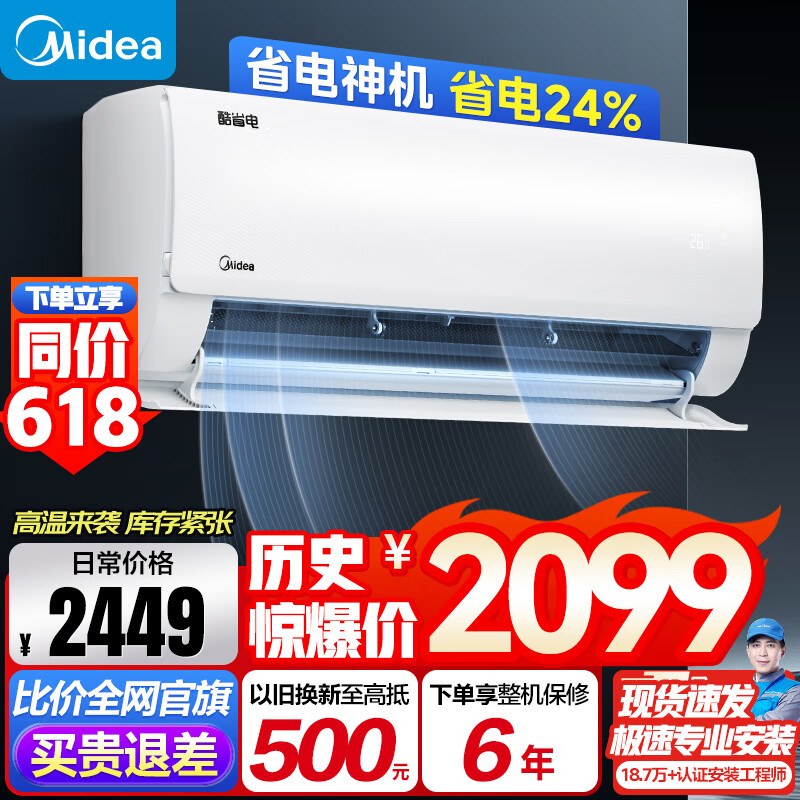 美的(Midea)酷省电 大1匹新一级能效空调全直流变频冷暖挂机节能舒爽风智能家用卧室壁挂式空调防直吹价格:2099.00元!