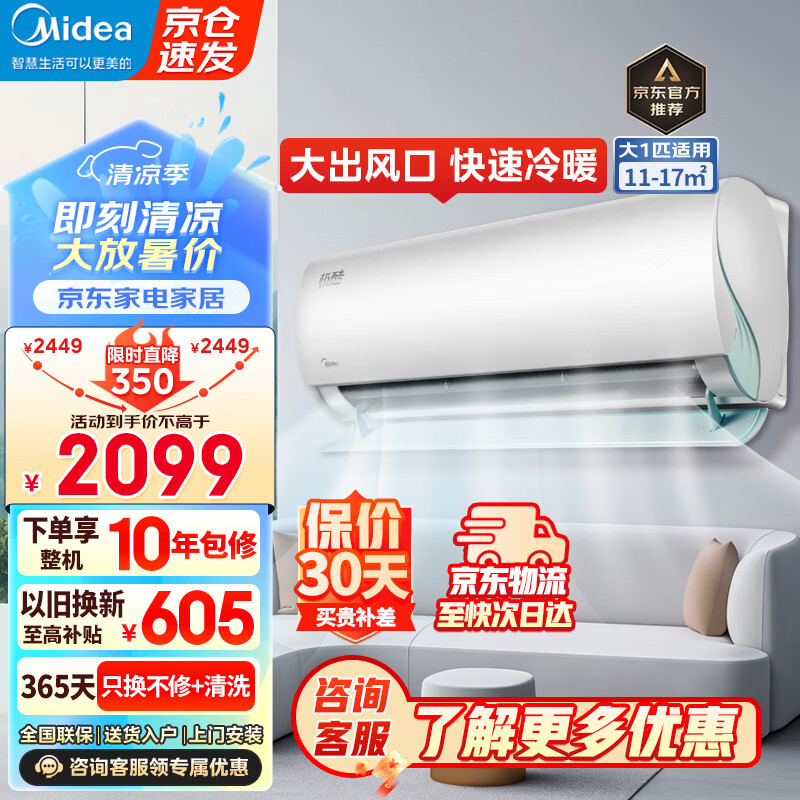美的(Midea) 极酷二代 大1匹 智能家电 新一级变频冷暖 壁挂式空调挂机大风量一键防直吹 KFR-26GW/N8VHA1Ⅱ价格:2099.00元!