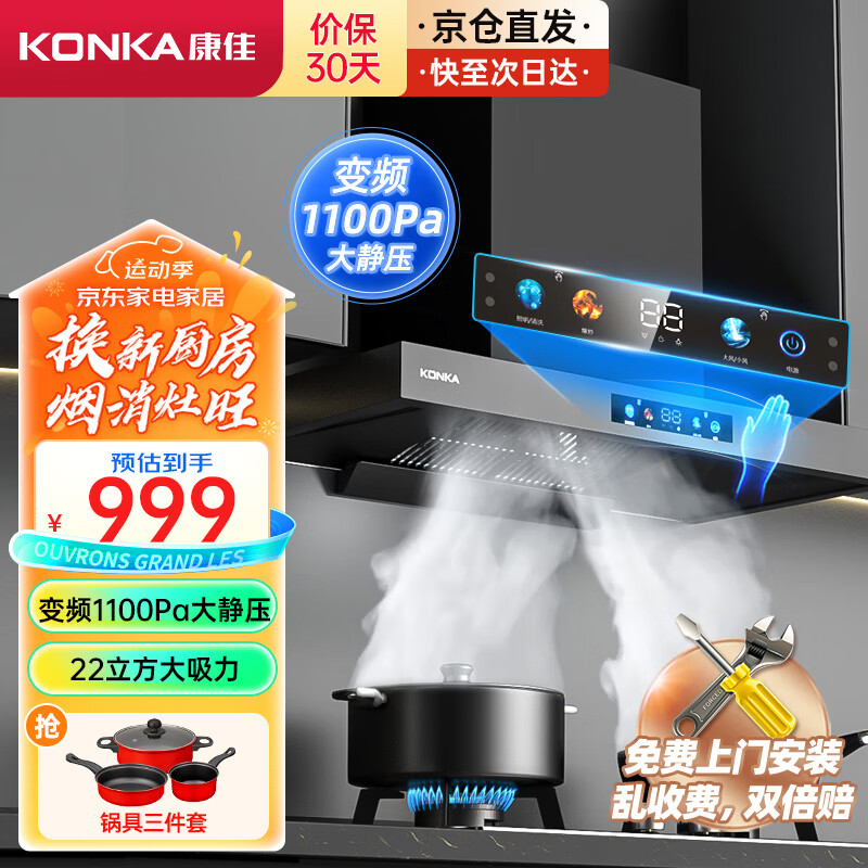 康佳(KONKA)抽油烟机家用 欧式顶吸式油烟机 变频1100Pa大静压 22m3/min爆炒吸力 8档风速 CXW-280-KT60B价格:999.00元!