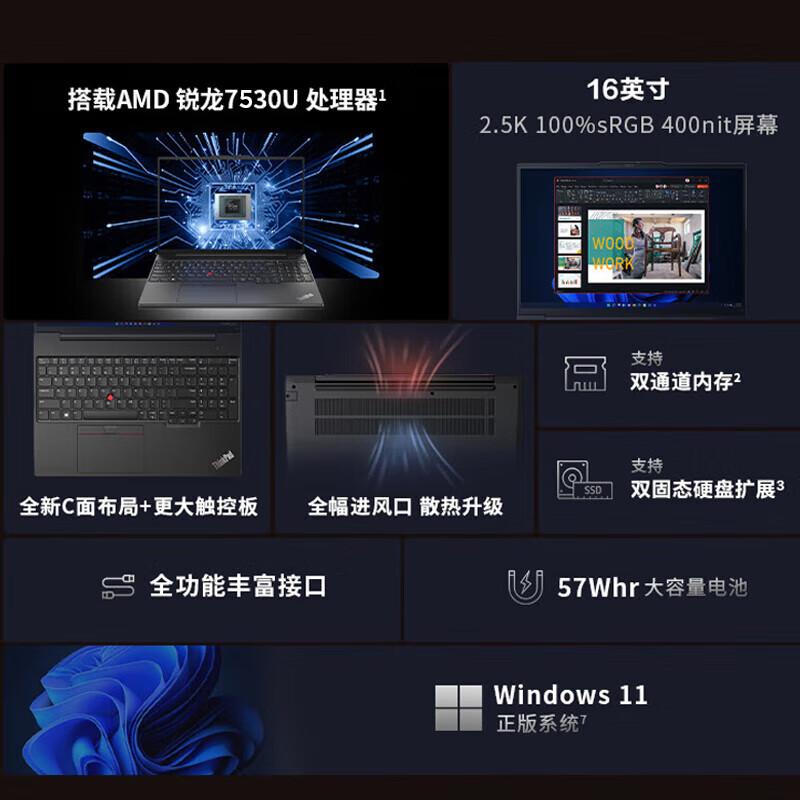 ThinkPad E16 16英寸轻薄大屏联想笔记本电脑 R5-7530U 16G 1T 2.5K 100%sRGB 黑 商务大屏 AI生态价格:4699.00元!