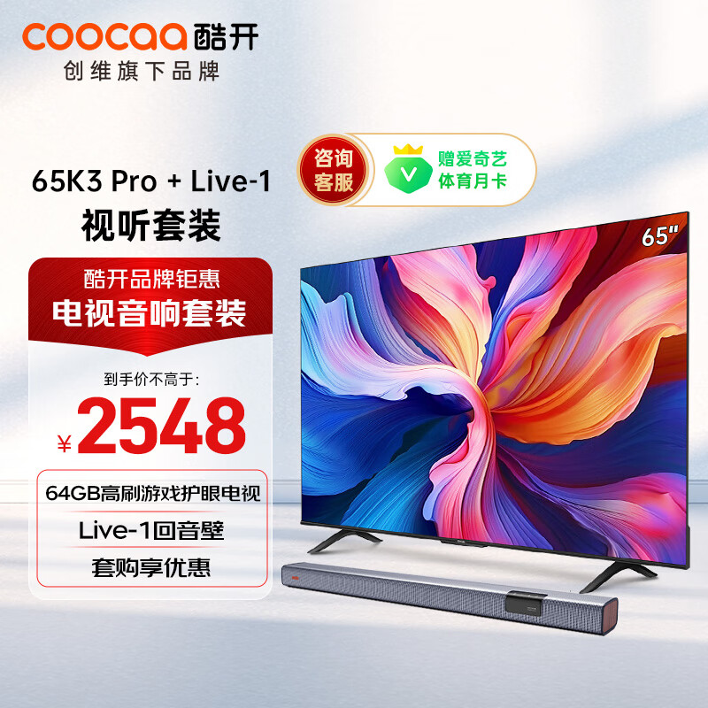 酷开创维 65英寸K3 Pro电视机+音响Live-1 回音壁 客厅家庭影院 壁挂条形音箱 蓝牙影院级娱乐体验套装价格:2548.00元!