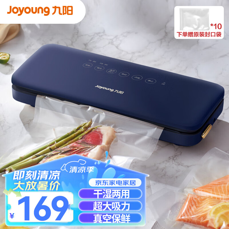 九阳(Joyoung)全自动真空包装机轻松按压干湿通用强劲大吸力加长封口设计10秒快速锁鲜外抽真空封口机AZ680 蓝色价格:169.00元!