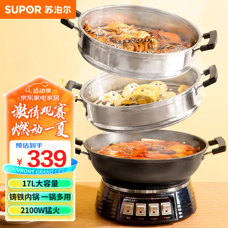 苏泊尔 SUPOR多用途锅 电蒸锅 多功能电煮锅电火锅电炒锅铸铁电热锅蒸包子锅双层蒸笼ZN32YK13价格:339.00元!