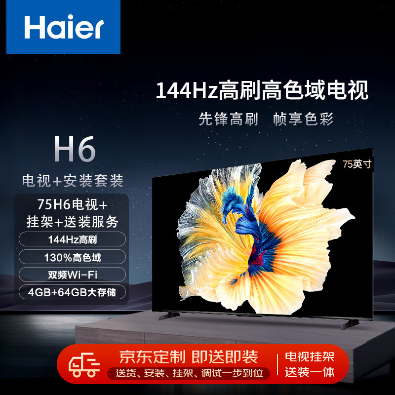 海尔(Haier)75H6 75英寸4K超高清144Hz屏4+64GB超薄游戏电视智能液晶平板电视机+安装服务【送装一体】价格:3798.00元!