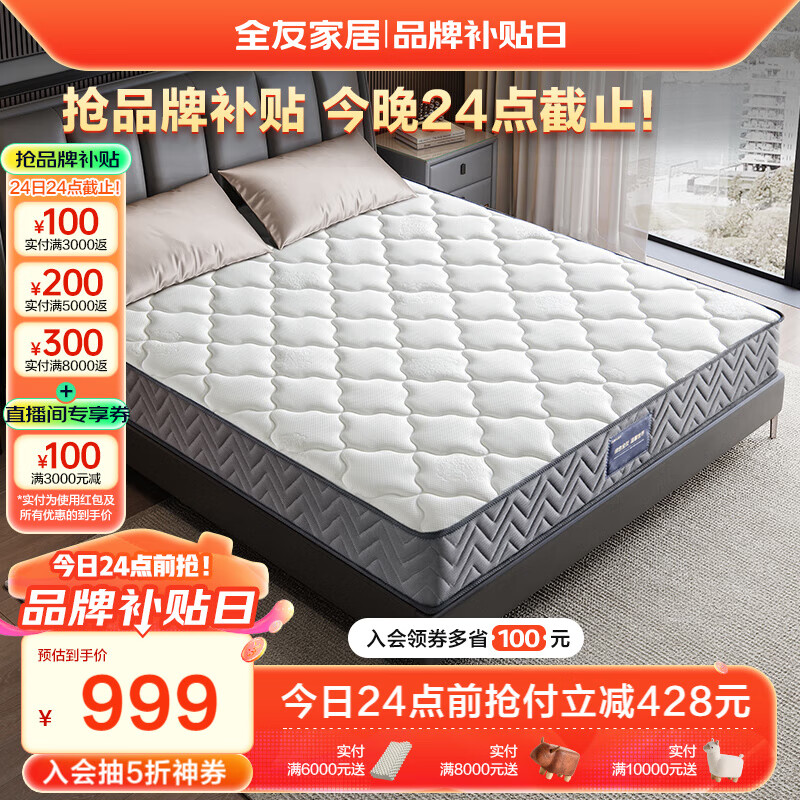 全友家居 进口天然乳胶床垫1.8x2米弹簧环保椰棕偏硬床垫子家用105190价格:1427.14元!