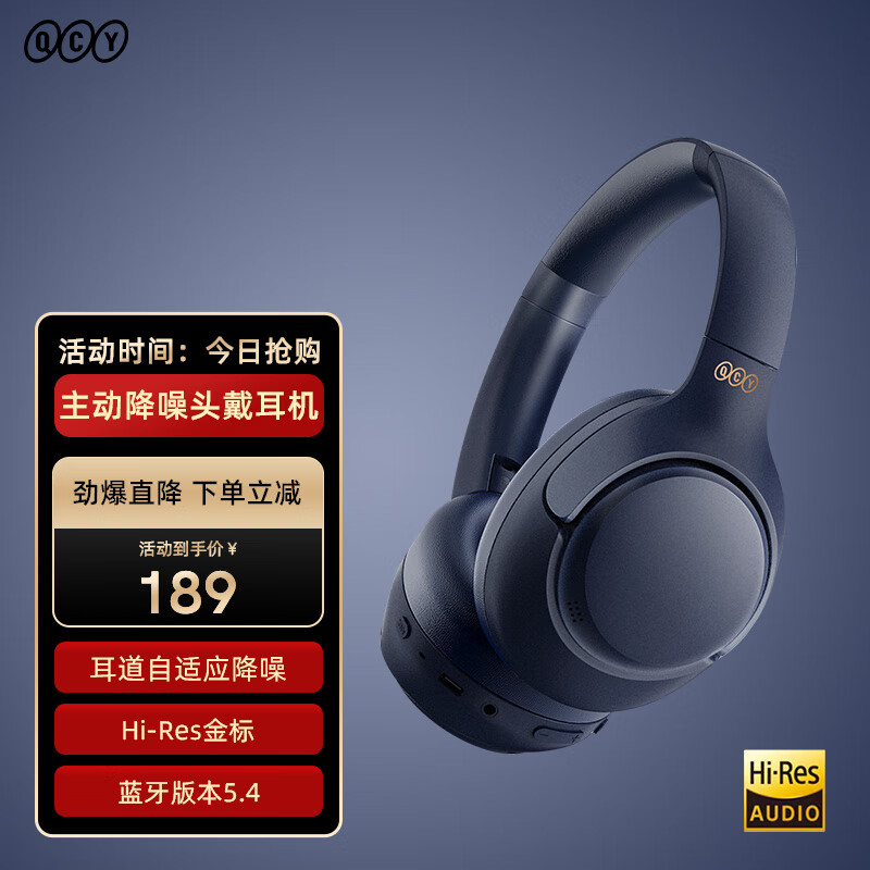 QCY H3 主动降噪 头戴蓝牙耳机重低音无线耳麦手机听力超长待机适用于全手机通用 蓝色价格:189.00元!