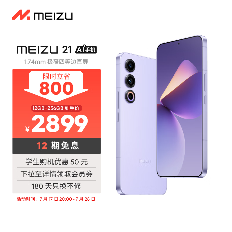 魅族(MEIZU)21 12GB+256GB 灵动紫 1.74mm极窄四等边直屏 骁龙8Gen3 2亿像素 80W超充 5G游戏学生拍照手机价格:2899.00元!
