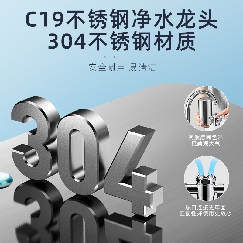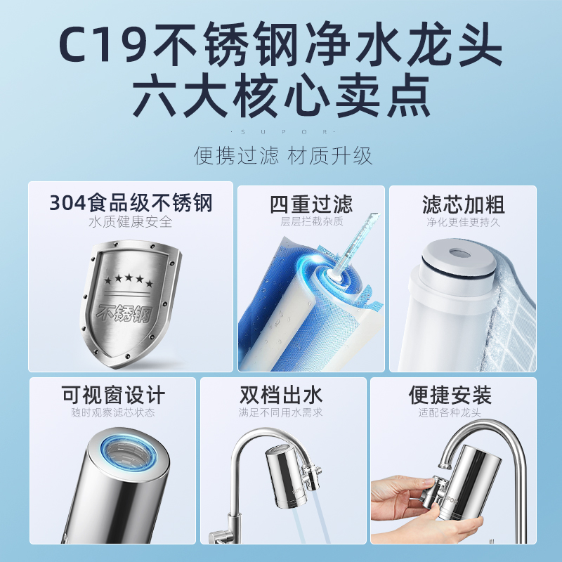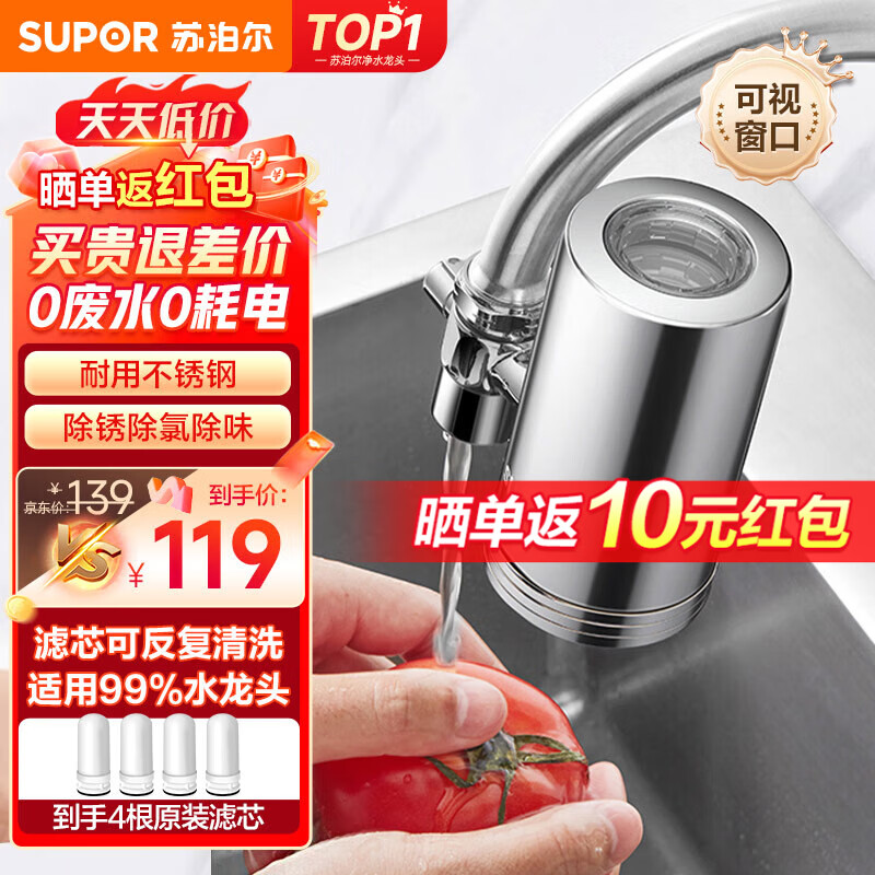 苏泊尔(SUPOR)净水器水龙头家用厨房自来水过滤器净水机滤芯可视化不锈钢C19一机四芯套装价格:119.00元!