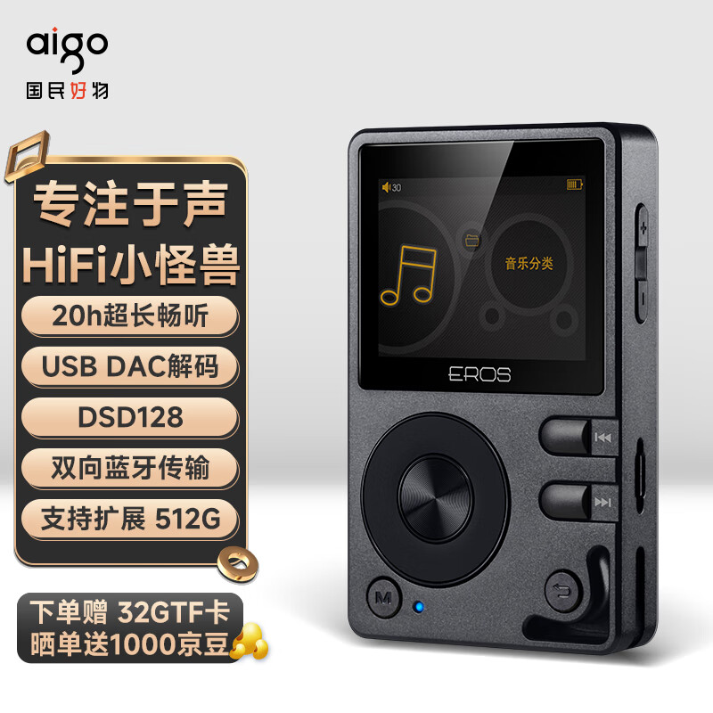 爱国者(aigo)EROS Q 蓝牙无损mp3音乐播放器 车载运动HIFI发烧DSD插卡迷你有屏学生随身听 灰色价格:649.00元!