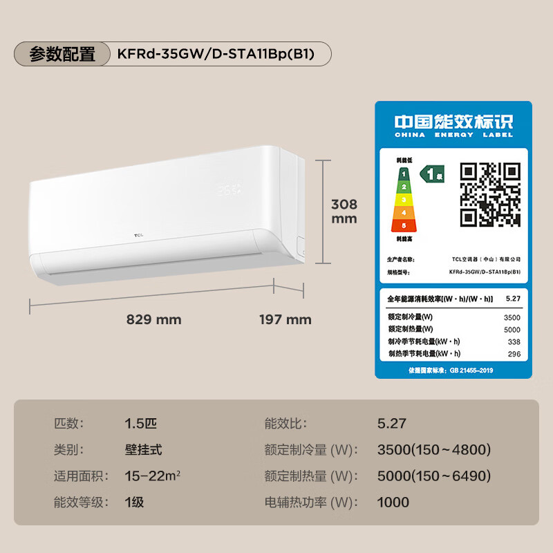 TCL 1.5匹 新一级能效 变频冷暖 易拆洗 壁挂式 空调挂机KFRd-35GW/D-STA11Bp(B1)省电节能价格:2399.00元!
